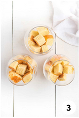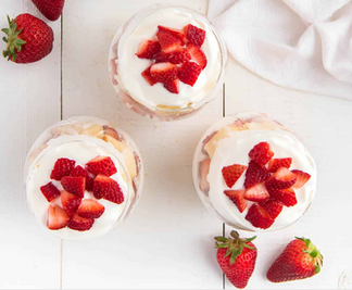 Layer cake, sliced strawberries, and whipped cream in clear cups.