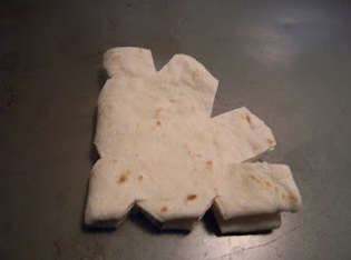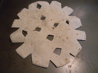 Fold the tortilla and cut it with a pair of kitchen shears like you would a paper snowflake. If your kids are bigger or if you have scissors safe for smaller children this is a fun activity for the kids to do. They do not need to be perfect, all snowflakes are different.
